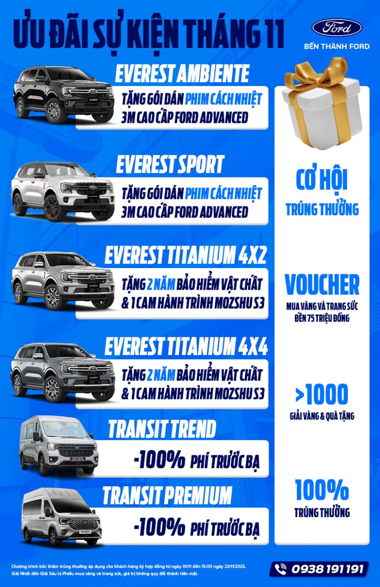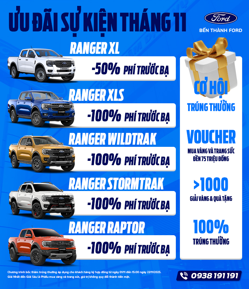 Từ ngày 01/11 đến 22/11/2025, Bến Thành Ford triển khai chương trình khuyến mãi lớn nhất trong tháng: Dành cho khách hàng ký hợp đồng mua xe Ford trong thời gian chương trình.