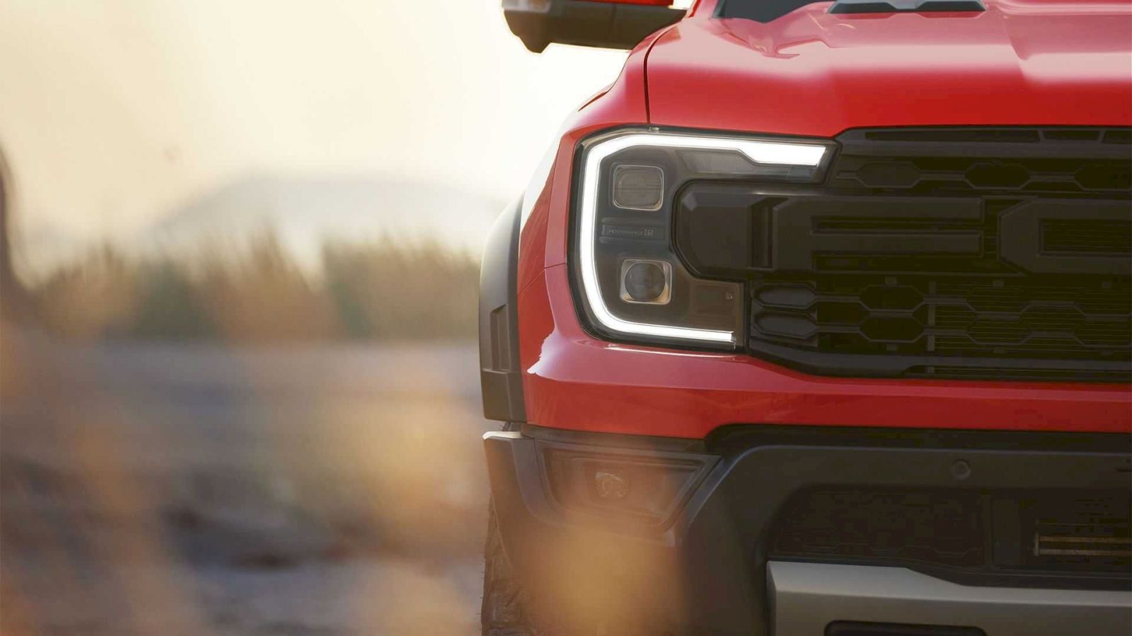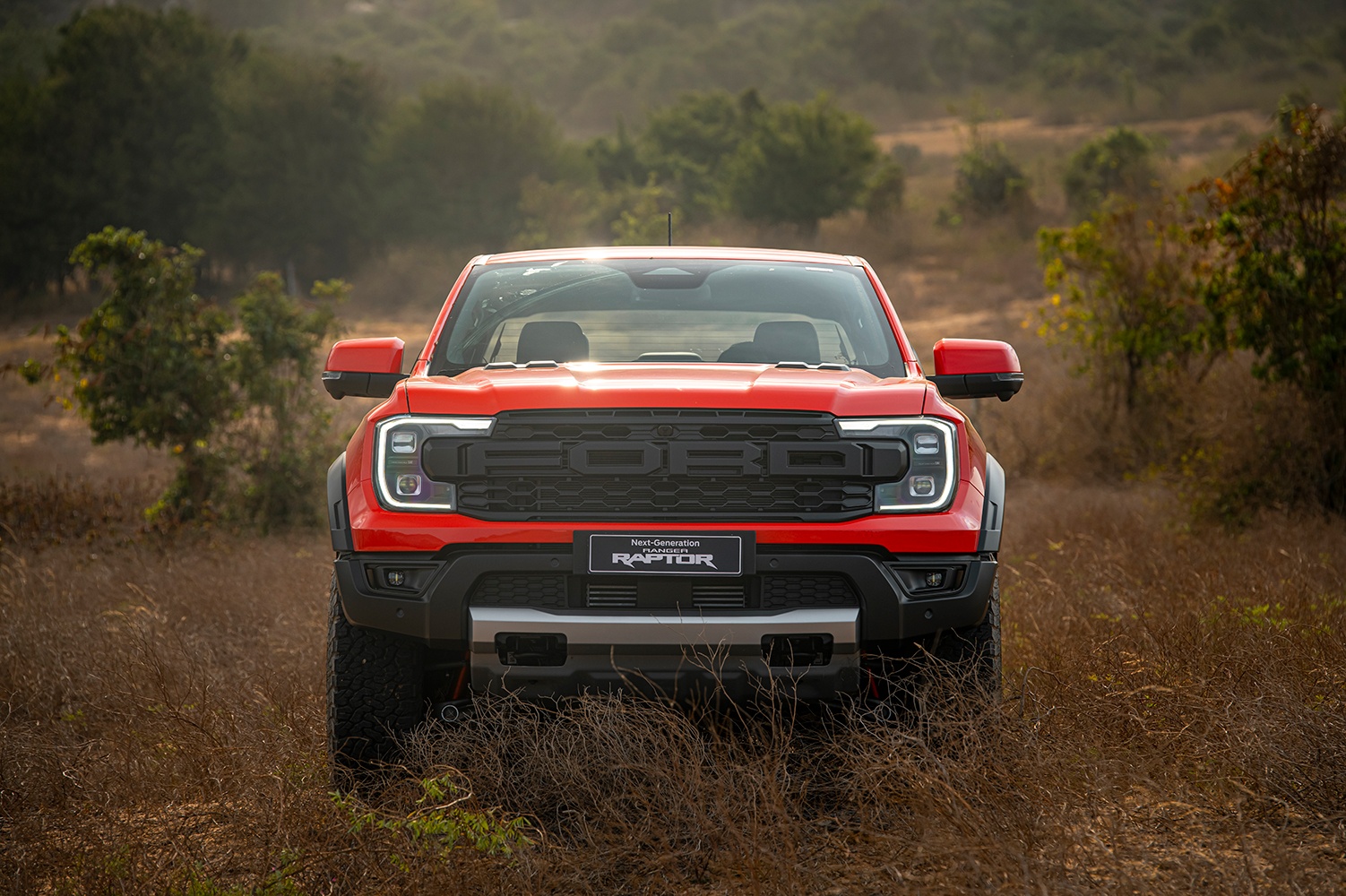 Góc nhìn trực diện cho thấy Ford Ranger Raptor 2024 như một “chiến binh cơ bắp” đầy uy lực. Lưới tản nhiệt cỡ lớn với họa tiết tổ ong cùng logo FORD nổi bật tạo điểm nhấn mạnh mẽ, kết hợp với cản trước hầm hố mang đến cảm giác sẵn sàng chinh phục mọi địa hình.