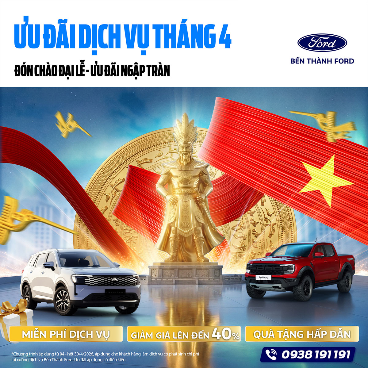 Hòa chung không khí náo nức chào đón kỳ nghỉ lễ lớn, Bến Thành Ford trân trọng gửi đến Quý khách hàng chương trình ưu đãi dịch vụ đặc biệt: “Đón chào đại lễ, ưu đãi ngập tràn”. Đây là dịp tuyệt vời để tân trang và bảo dưỡng “xế cưng”, đảm bảo sự an toàn và vận hành hoàn hảo cho những chuyến hành trình xa.