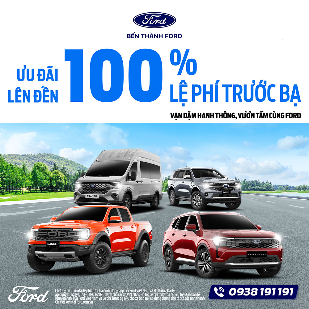 Xuân sang, vạn vật bừng lên sức sống mới, cũng là lúc bạn sẵn sàng cho những hành trình và mục tiêu kinh doanh lớn lao trong năm 2026! Để chắp cánh cho những dự định đó, Bến Thành Ford hân hạnh đồng hành cùng Quý khách hàng với chương trình ưu đãi đặc biệt tháng 3: Hỗ trợ LÊN ĐẾN 100% LỆ PHÍ TRƯỚC BẠ cùng vô vàn quà tặng phụ kiện, bảo hiểm giá trị.