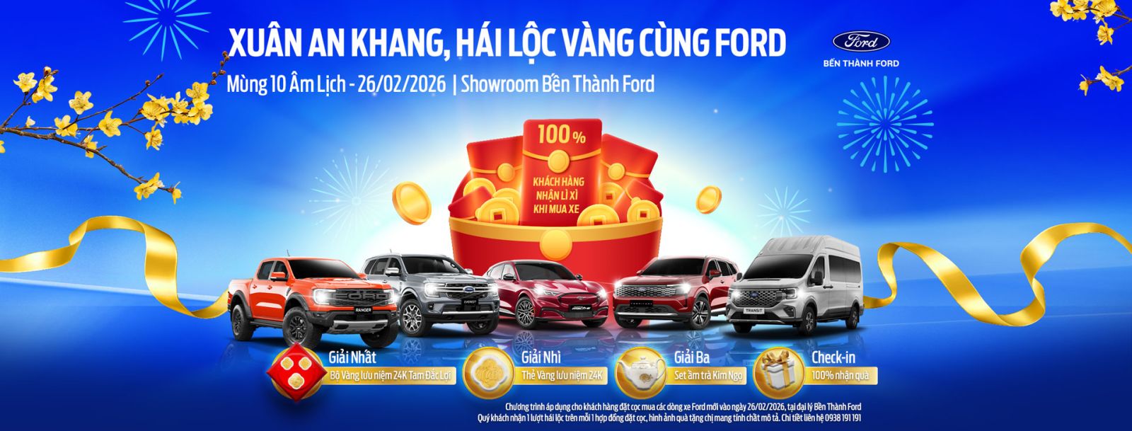 Mừng Xuân Bính Ngọ 2026, với mong muốn mang lại sự thịnh vượng và may mắn trong năm mới cho quý khách hàng, Bến Thành Ford hân hạnh mang đến chương trình ưu đãi đặc biệt: "Xuân An Khang - Hái Lộc Vàng". Đây là cơ hội vàng có 1-0-2 để sở hữu những dòng xe Ford mạnh mẽ và rinh ngay lộc may mắn đầu năm trong dịp Vía Thần Tài.