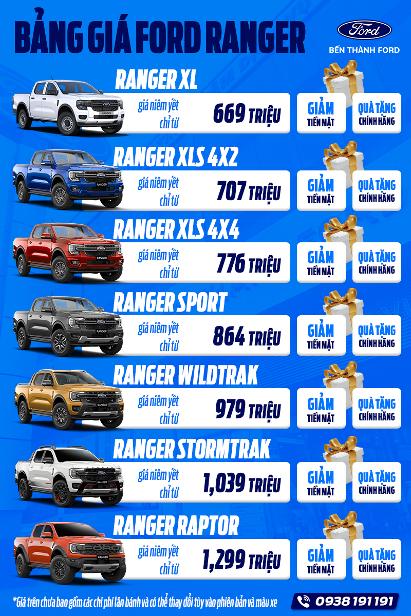 Bến Thành Ford hiện đang phân phối chính hãng, đa dạng các dòng xe từ bán tải, SUV cho đến xe thương mại, đáp ứng mọi nhu cầu sử dụng của khách hàng Việt. Tại Bến Thành Ford – đại lý ủy quyền chính hãng tại TP.HCM (quận Tân Phú), cập nhật giá bán mới nhất, khuyến mãi hấp dẫn và dịch vụ tận tâm.