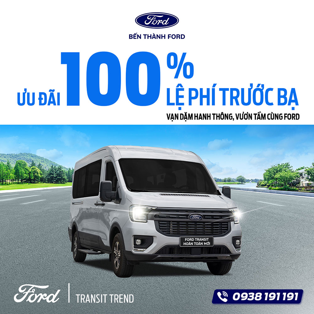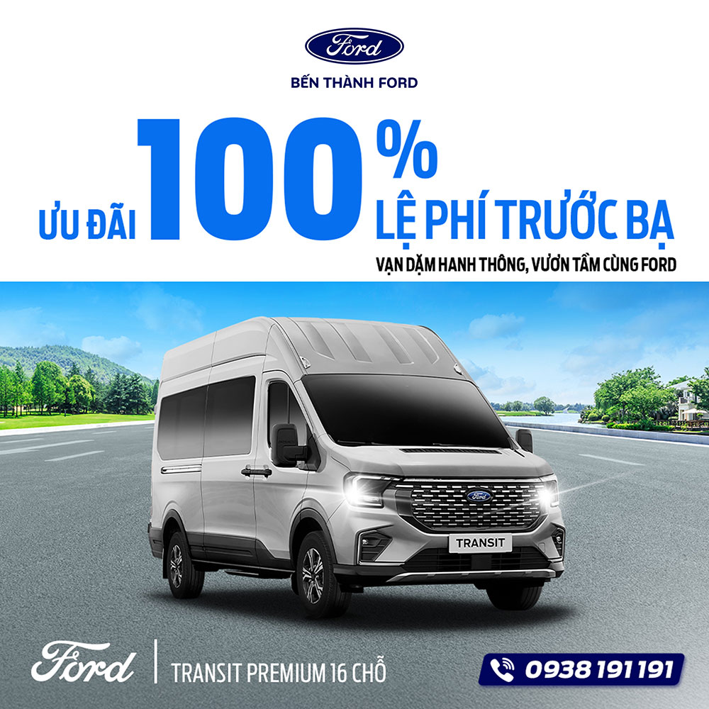 - Ford Transit Trend & Premium (16 chỗ): Nhận ngay ưu đãi khủng 100% lệ phí trước bạ, giải pháp hoàn hảo để tối ưu hóa chi phí đầu tư kinh doanh.