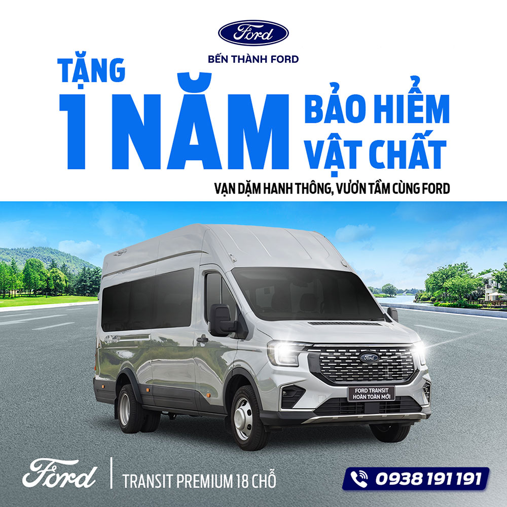 - Ford Transit Premium (18 chỗ): Tặng 01 năm bảo hiểm vật chất, giúp Quý khách an tâm khai thác dịch vụ trên mọi nẻo đường.